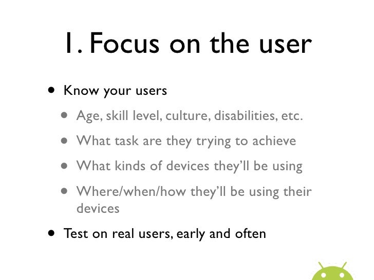 13. 13. 1. Focus on the user• Know your users • Age, skill level, culture, disabilities, etc. • What task are they trying to achieve • What kinds of devices they’ll be using • Where/when/how they’ll be using their devices• Test on real users, early and often