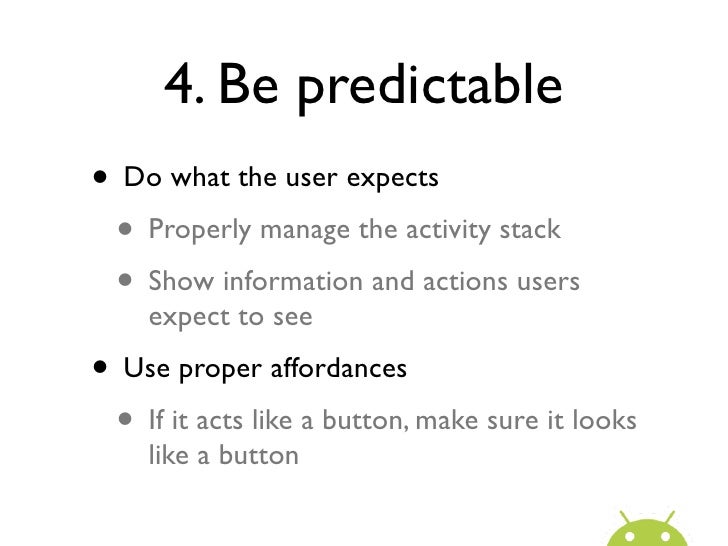 16. 16. 4. Be predictable• Do what the user expects • Properly manage the activity stack • Show information and actions users expect to see• Use proper affordances • If it acts like a button, make sure it looks like a button