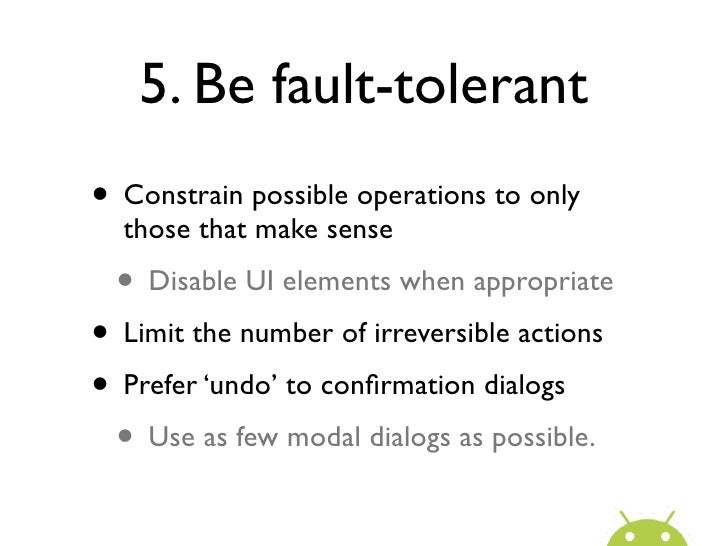 17. 17. 5. Be fault-tolerant• Constrain possible operations to only those that make sense • Disable UI elements when appropriate• Limit the number of irreversible actions• Prefer ‘undo’ to confirmation dialogs • Use as few modal dialogs as possible.