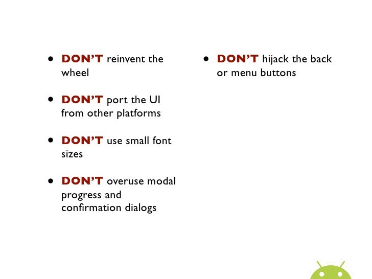 19. 19. • DON’T reinvent the • DON’T hijack the back wheel or menu buttons• DON’T port the UI from other platforms• DON’T use small font sizes• DON’T overuse modal progress and confirmation dialogs