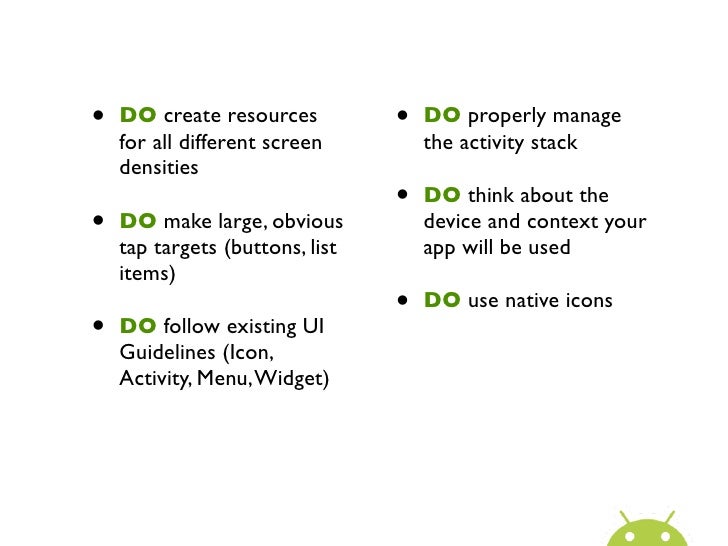20. 20. • DO create resources • DO properly manage for all different screen the activity stack densities • DO think about the• DO make large, obvious device and context your tap targets (buttons, list app will be used items) • DO use native icons• DO follow existing UI Guidelines (Icon, Activity, Menu, Widget)