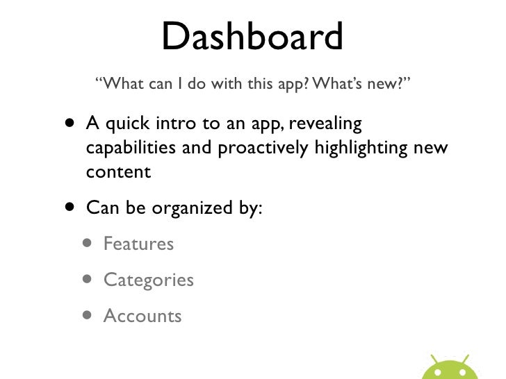 27. 27. Dashboard “What can I do with this app? What’s new?”• A quick intro to an app, revealing capabilities and proactively highlighting new content• Can be organized by: • Features • Categories • Accounts