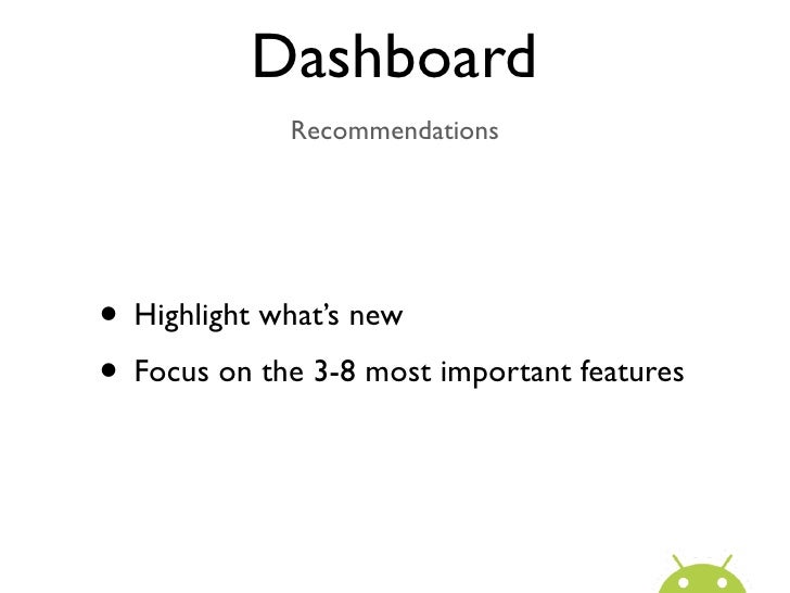 28. 28. Dashboard Recommendations• Highlight what’s new• Focus on the 3-8 most important features