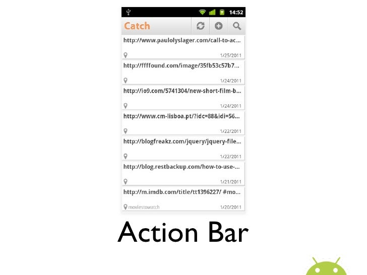 24. 24. Android UI Design Patterns• Dashboard• Action Bar• Quick Actions• Search Bar• Tabs• Lists• ...