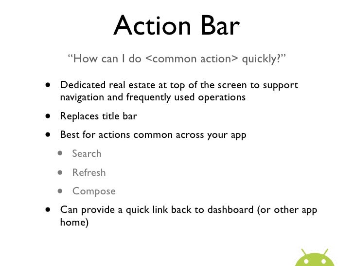 31. 31. Action Bar “How can I do <common action> quickly?”• Dedicated real estate at top of the screen to support navigation and frequently used operations• Replaces title bar• Best for actions common across your app • Search • Refresh • Compose• Can provide a quick link back to dashboard (or other app home)