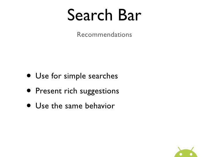 39. 39. Search Bar “How can I find something?”• Consistent pop-in search form anchored to top of screen• Replaces action bar (if present)• Support suggestions• Can use a Quick Action selector to alter search mode • Alternately, can offer suggestions for primary search mode, and additional items for triggering other modes