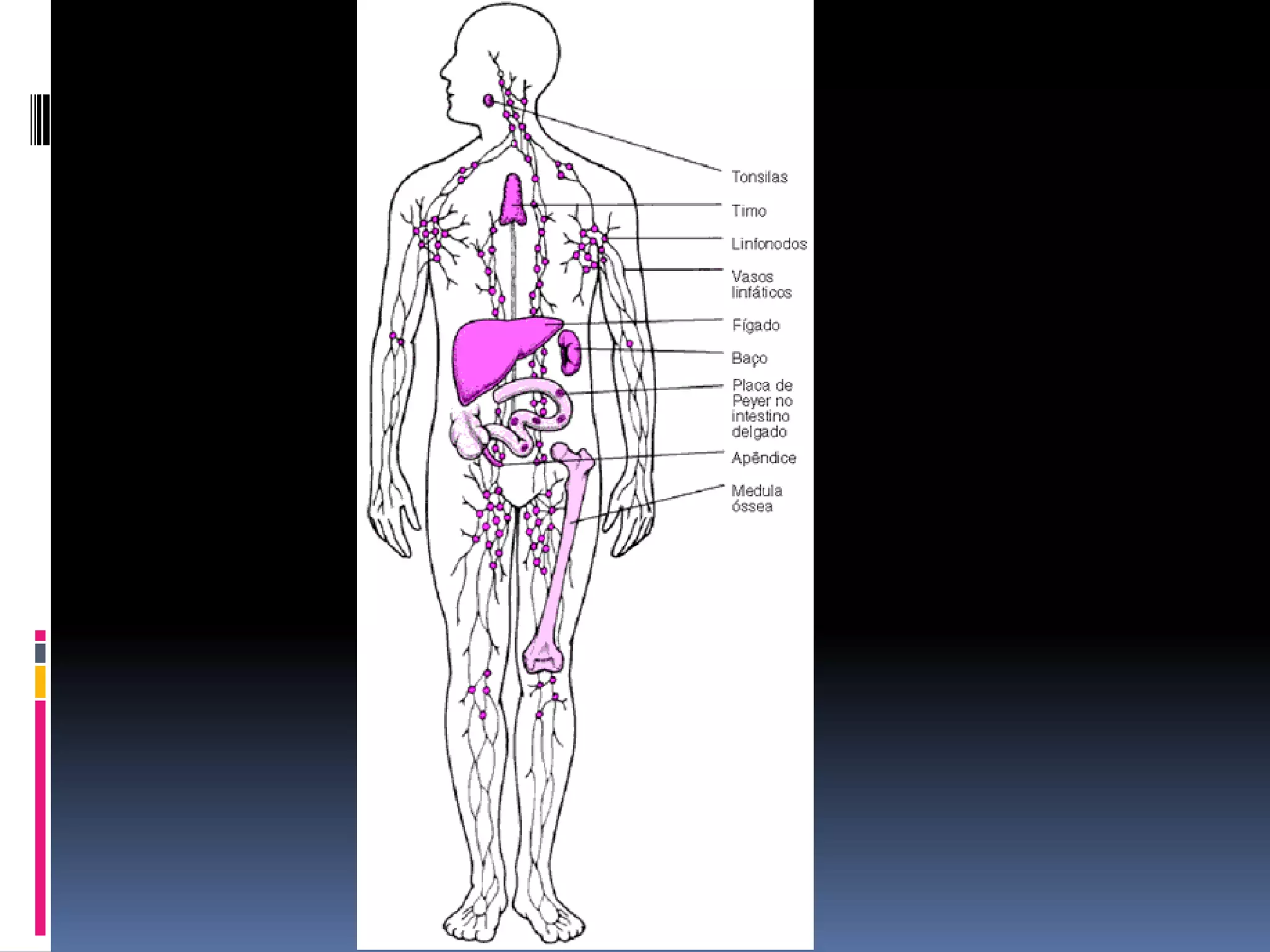 O documento descreve as funções do sistema linfático e imunológico, incluindo drenar o excesso de líquido dos tecidos, absorver gordura e produzir células imunes. Também explica que o sistema imunológico defende o organismo contra invasores, remove células anormais e mortas, e é composto por células de defesa, imunoglobulinas, linfócitos que combatem invasores, e propriedades de proteção.
