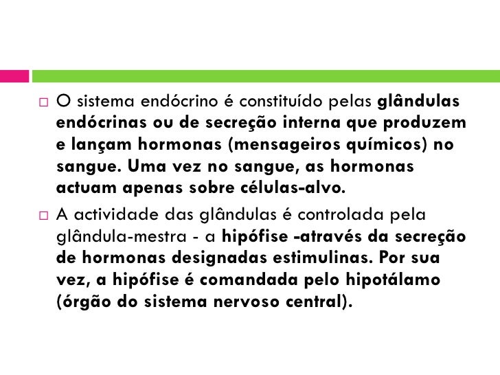 2. 2.  O sistema endócrino é constituído pelas glândulas endócrinas ou de secreção interna que produzem e lançam hormonas (mensageiros químicos) no sangue. Uma vez no sangue, as hormonas actuam apenas sobre células-alvo.  A actividade das glândulas é controlada pela glândula-mestra - a hipófise -através da secreção de hormonas designadas estimulinas. Por sua vez, a hipófise é comandada pelo hipotálamo (órgão do sistema nervoso central).