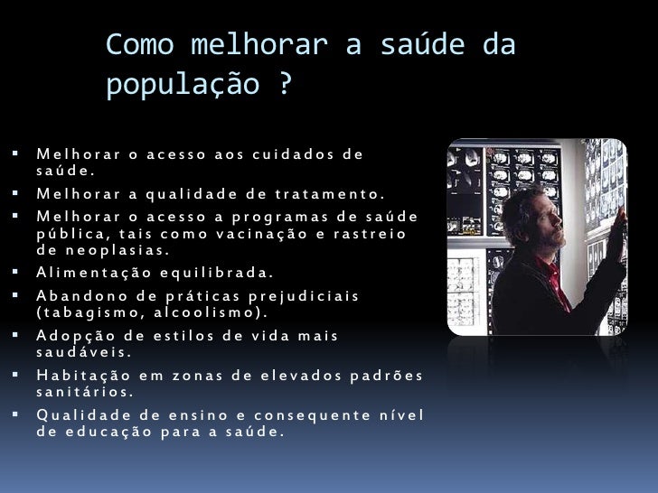 15. 15. Como melhorar a saúde da população ?  Melhorar o acesso aos cuidados de saúde.  Melhorar a qualidade de tratamento.  Melhorar o acesso a programas de saúde pública, tais como vacinação e rastreio de neoplasias.  Alimentação equilibrada.  Abandono de práticas prejudiciais (tabagismo, alcoolismo).  Adopção de estilos de vida mais saudáveis.  Habitação em zonas de elevados padrões sanitários.  Qualidade de ensino e consequente nível de educação para a saúde.