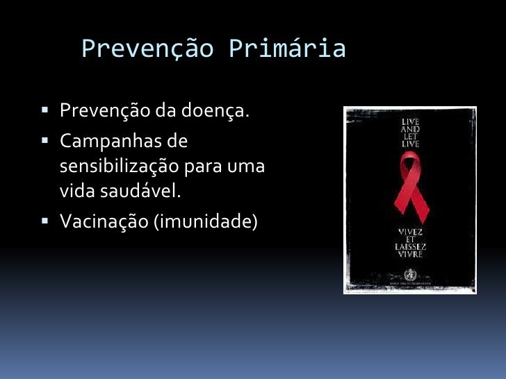17. 17. Prevenção Primária  Prevenção da doença.  Campanhas de sensibilização para uma vida saudável.  Vacinação (imunidade)