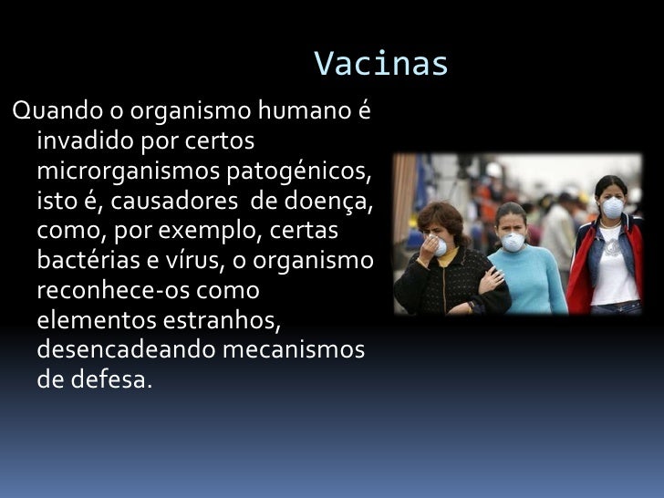 18. 18. Vacinas Quando o organismo humano é invadido por certos microrganismos patogénicos, isto é, causadores de doença, como, por exemplo, certas bactérias e vírus, o organismo reconhece-os como elementos estranhos, desencadeando mecanismos de defesa.
