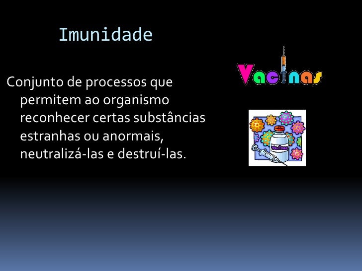19. 19. Imunidade Conjunto de processos que permitem ao organismo reconhecer certas substâncias estranhas ou anormais, neutralizá-las e destruí-las.