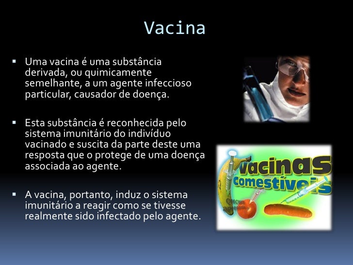 21. 21. Vacina  Uma vacina é uma substância derivada, ou quimicamente semelhante, a um agente infeccioso particular, causador de doença.  Esta substância é reconhecida pelo sistema imunitário do indivíduo vacinado e suscita da parte deste uma resposta que o protege de uma doença associada ao agente.  A vacina, portanto, induz o sistema imunitário a reagir como se tivesse realmente sido infectado pelo agente.
