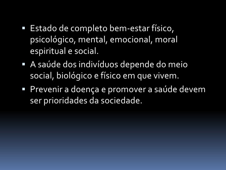 3. 3.  Estado de completo bem-estar físico, psicológico, mental, emocional, moral espiritual e social.  A saúde dos indivíduos depende do meio social, biológico e físico em que vivem.  Prevenir a doença e promover a saúde devem ser prioridades da sociedade.
