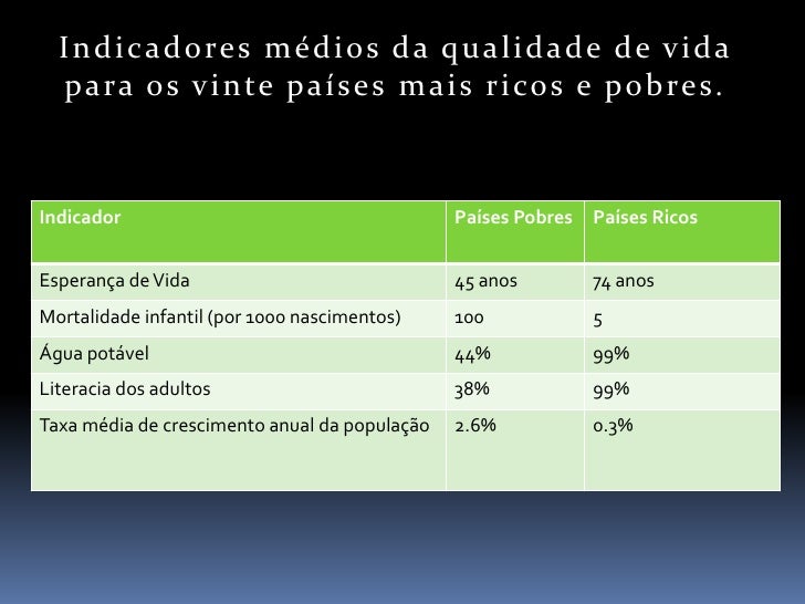 6. 6. I n d i c a d o re s m é d i o s d a q u a l i d a d e d e v i d a p a ra o s v i n te p a í s e s m a i s r i co s e p o b re s. Indicador Países Pobres Países Ricos Esperança de Vida 45 anos 74 anos Mortalidade infantil (por 1000 nascimentos) 100 5 Água potável 44% 99% Literacia dos adultos 38% 99% Taxa média de crescimento anual da população 2.6% 0.3%