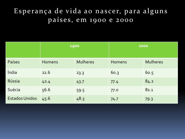 7. 7. E s p e ra n ç a d e v i d a a o n a s ce r, p a ra a l g u n s p a í s e s, e m 1 9 0 0 e 2 0 0 0 1900 2000 Países Homens Mulheres Homens Mulheres Índia 22.6 23.3 60.3 60.5 Rússia 42.4 43.7 77.4 84.2 Suécia 56.6 59.5 77.0 82.1 Estados Unidos 45.6 48.3 74.7 79.3