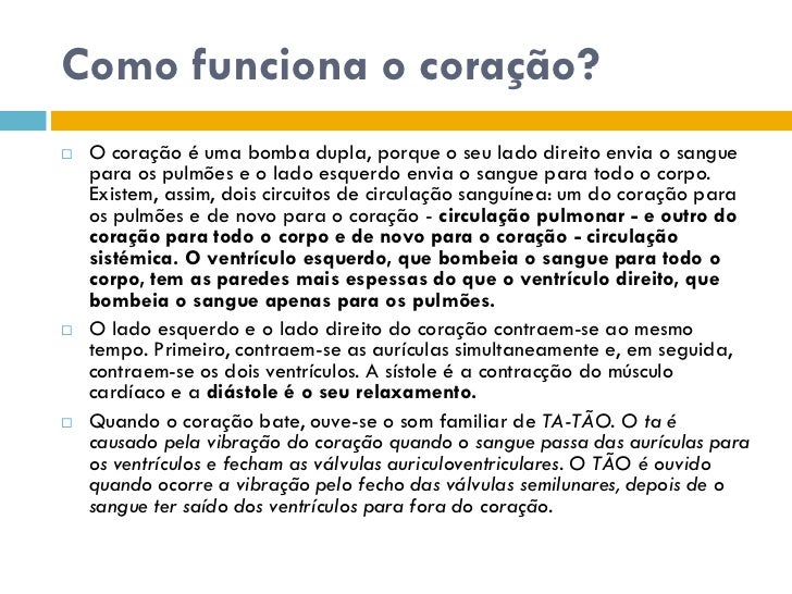 2. 2. Como funciona o coração?  O coração é uma bomba dupla, porque o seu lado direito envia o sangue para os pulmões e o lado esquerdo envia o sangue para todo o corpo. Existem, assim, dois circuitos de circulação sanguínea: um do coração para os pulmões e de novo para o coração - circulação pulmonar - e outro do coração para todo o corpo e de novo para o coração - circulação sistémica. O ventrículo esquerdo, que bombeia o sangue para todo o corpo, tem as paredes mais espessas do que o ventrículo direito, que bombeia o sangue apenas para os pulmões.  O lado esquerdo e o lado direito do coração contraem-se ao mesmo tempo. Primeiro, contraem-se as aurículas simultaneamente e, em seguida, contraem-se os dois ventrículos. A sístole é a contracção do músculo cardíaco e a diástole é o seu relaxamento.  Quando o coração bate, ouve-se o som familiar de TA-TÃO. O ta é causado pela vibração do coração quando o sangue passa das aurículas para os ventrículos e fecham as válvulas auriculoventriculares. O TÃO é ouvido quando ocorre a vibração pelo fecho das válvulas semilunares, depois de o sangue ter saído dos ventrículos para fora do coração.