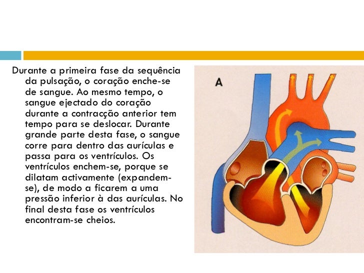 3. 3. Durante a primeira fase da sequência da pulsação, o coração enche-se de sangue. Ao mesmo tempo, o sangue ejectado do coração durante a contracção anterior tem tempo para se deslocar. Durante grande parte desta fase, o sangue corre para dentro das aurículas e passa para os ventrículos. Os ventrículos enchem-se, porque se dilatam activamente (expandem- se), de modo a ficarem a uma pressão inferior à das aurículas. No final desta fase os ventrículos encontram-se cheios.
