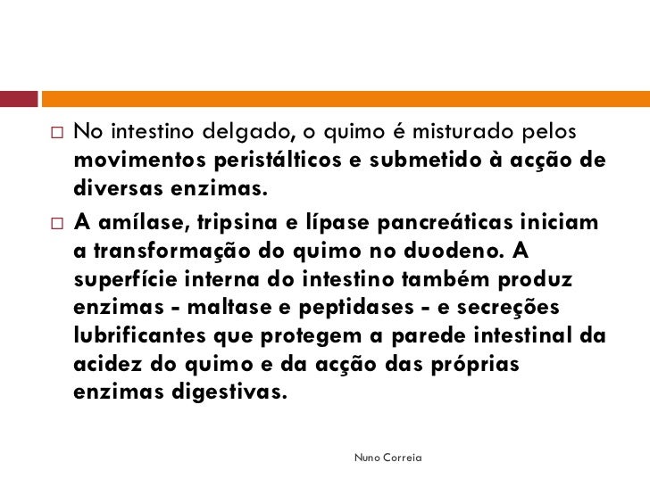 11. 11.  No intestino delgado, o quimo é misturado pelos movimentos peristálticos e submetido à acção de diversas enzimas.  A amílase, tripsina e lípase pancreáticas iniciam a transformação do quimo no duodeno. A superfície interna do intestino também produz enzimas - maltase e peptidases - e secreções lubrificantes que protegem a parede intestinal da acidez do quimo e da acção das próprias enzimas digestivas. Nuno Correia