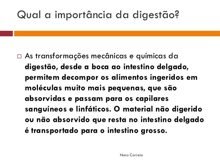 13. 13. Qual a importância da digestão?  As transformações mecânicas e químicas da digestão, desde a boca ao intestino delgado, permitem decompor os alimentos ingeridos em moléculas muito mais pequenas, que são absorvidas e passam para os capilares sanguíneos e linfáticos. O material não digerido ou não absorvido que resta no intestino delgado é transportado para o intestino grosso. Nuno Correia