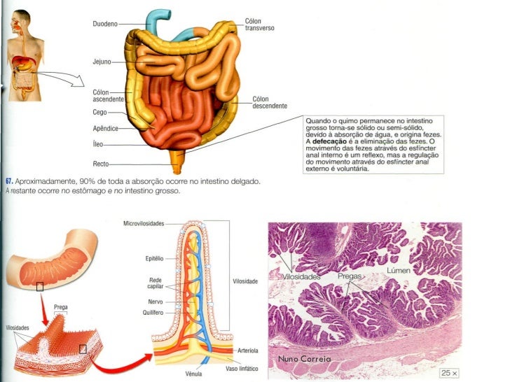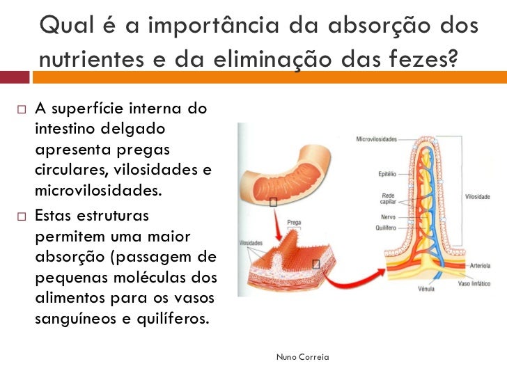 15. 15. Qual é a importância da absorção dos nutrientes e da eliminação das fezes?  A superfície interna do intestino delgado apresenta pregas circulares, vilosidades e microvilosidades.  Estas estruturas permitem uma maior absorção (passagem de pequenas moléculas dos alimentos para os vasos sanguíneos e quilíferos. Nuno Correia