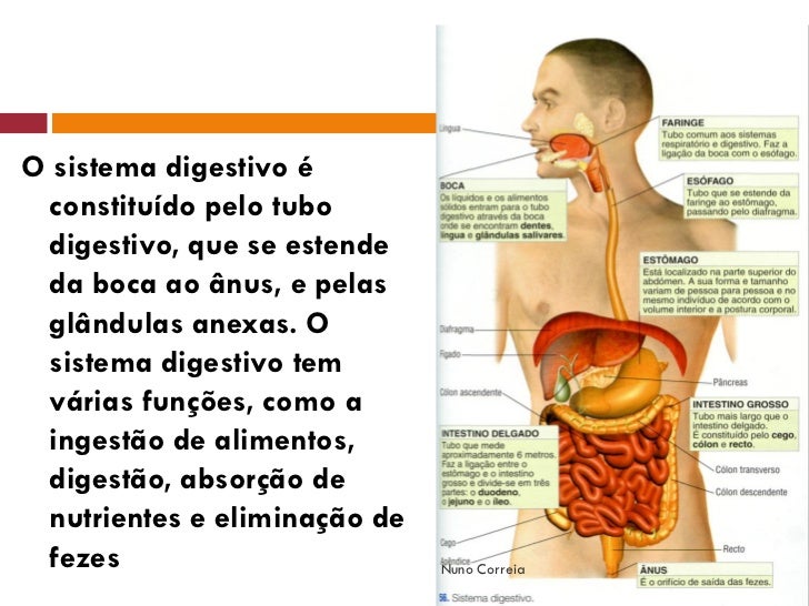 2. 2. O sistema digestivo é constituído pelo tubo digestivo, que se estende da boca ao ânus, e pelas glândulas anexas. O sistema digestivo tem várias funções, como a ingestão de alimentos, digestão, absorção de nutrientes e eliminação de fezes Nuno Correia
