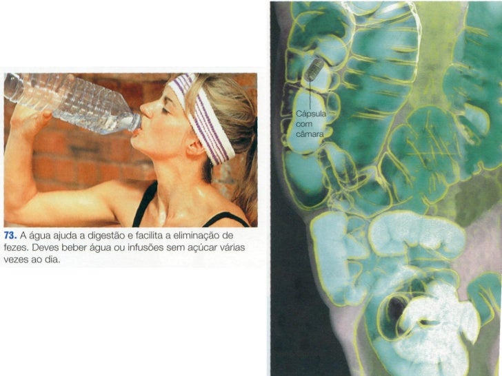 16. 16.  Após a absorção no intestino delgado, o restante quimo passa para o intestino grosso.  No intestino grosso, são absorvidos a água e os minerais armazenadas nas fezes antes de serem defecadas.  A eliminação é o processo através do qual os resíduos da digestão são expulsos do organismo. Nuno Correia