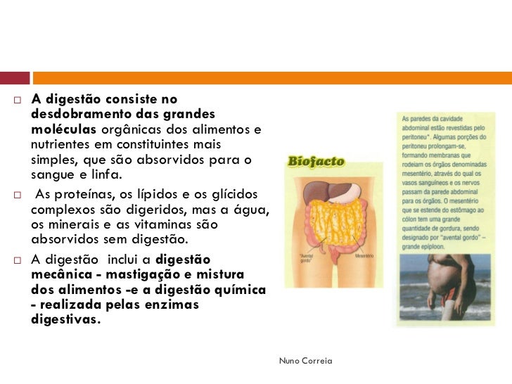 3. 3.  A digestão consiste no desdobramento das grandes moléculas orgânicas dos alimentos e nutrientes em constituintes mais simples, que são absorvidos para o sangue e linfa.  As proteínas, os lípidos e os glícidos complexos são digeridos, mas a água, os minerais e as vitaminas são absorvidos sem digestão.  A digestão inclui a digestão mecânica - mastigação e mistura dos alimentos -e a digestão química - realizada pelas enzimas digestivas. Nuno Correia