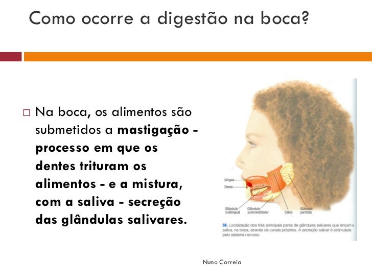 4. 4. Como ocorre a digestão na boca?  Na boca, os alimentos são submetidos a mastigação - processo em que os dentes trituram os alimentos - e a mistura, com a saliva - secreção das glândulas salivares. Nuno Correia