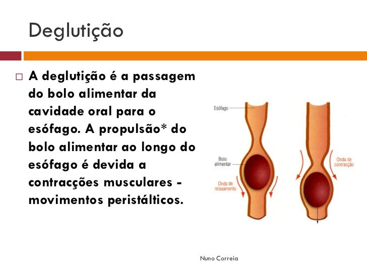 5. 5. Deglutição  A deglutição é a passagem do bolo alimentar da cavidade oral para o esófago. A propulsão* do bolo alimentar ao longo do esófago é devida a contracções musculares - movimentos peristálticos. Nuno Correia
