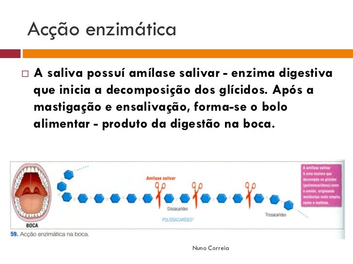 6. 6. Acção enzimática  A saliva possuí amílase salivar - enzima digestiva que inicia a decomposição dos glícidos. Após a mastigação e ensalivação, forma-se o bolo alimentar - produto da digestão na boca. Nuno Correia