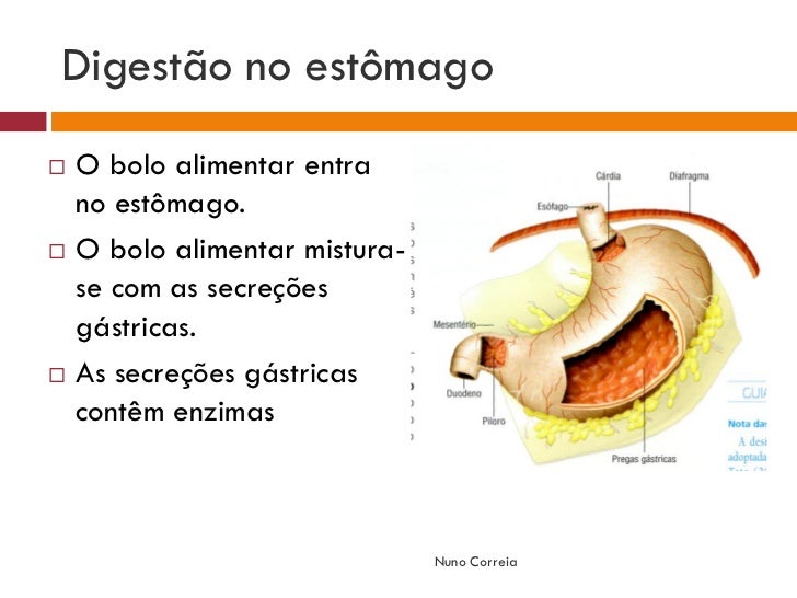 7. 7. Digestão no estômago  O bolo alimentar entra no estômago.  O bolo alimentar mistura- se com as secreções gástricas.  As secreções gástricas contêm enzimas Nuno Correia
