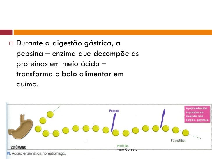 8. 8.  Durante a digestão gástrica, a pepsina – enzima que decompõe as proteínas em meio ácido – transforma o bolo alimentar em quimo. Nuno Correia