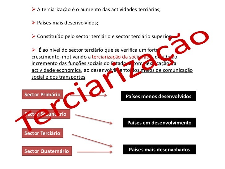 9. 9.  A terciarização é o aumento das actividades terciárias;  Países mais desenvolvidos;  Constituído pelo sector terciário e sector terciário superior;  É ao nível do sector terciário que se verifica um forte crescimento, motivando a terciarização da sociedade, devido ao incremento das funções sociais do Estado, à complexificação da actividade económica, ao desenvolvimento dos meios de comunicação social e dos transportes.Sector Primário Países menos desenvolvidosSector Secundário Países em desenvolvimentoSector TerciárioSector Quaternário Países mais desenvolvidos
