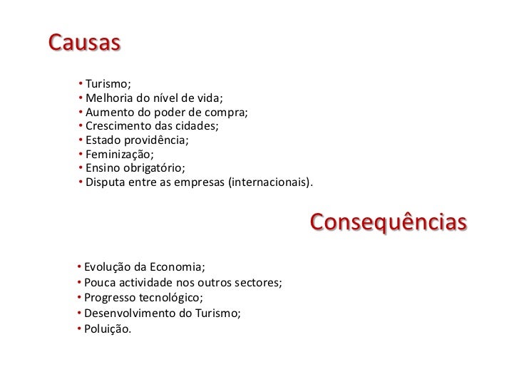 10. 10. Causas • Turismo; • Melhoria do nível de vida; • Aumento do poder de compra; • Crescimento das cidades; • Estado providência; • Feminização; • Ensino obrigatório; • Disputa entre as empresas (internacionais). Consequências • Evolução da Economia; • Pouca actividade nos outros sectores; • Progresso tecnológico; • Desenvolvimento do Turismo; • Poluição.