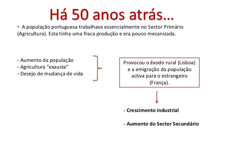 11. 11. Há 50 anos atrás…• A população portuguesa trabalhava essencialmente no Sector Primário(Agricultura). Esta tinha uma fraca produção e era pouco mecanizada.- Aumento da população Provocou o êxodo rural (Lisboa)- Agricultura “exausta” e a emigração da população- Desejo de mudança de vida activa para o estrangeiro (França). - Crescimento industrial - Aumento do Sector Secundário