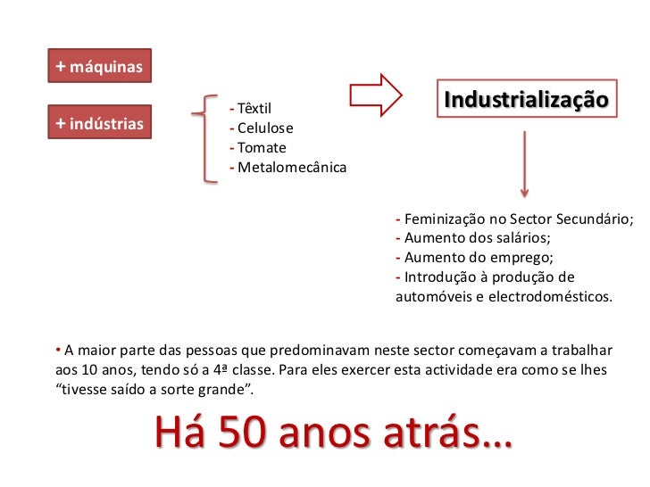 12. 12. + máquinas - Têxtil Industrialização+ indústrias - Celulose - Tomate - Metalomecânica - Feminização no Sector Secundário; - Aumento dos salários; - Aumento do emprego; - Introdução à produção de automóveis e electrodomésticos.• A maior parte das pessoas que predominavam neste sector começavam a trabalharaos 10 anos, tendo só a 4ª classe. Para eles exercer esta actividade era como se lhes“tivesse saído a sorte grande”. Há 50 anos atrás…