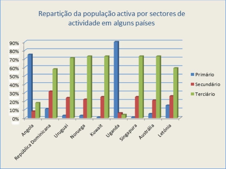 14. 14. Relativamente a este gráfico, concluímos que tanto a Angola como o Uganda são países de baixodesenvolvimento pois apresentam altas percentagens no sector primário, enquanto os restantescomo têm elevadas taxas no sector terciário em princípio são mais desenvolvidos. Digo emprincípio porque neste gráfico temos um bom exemplo, é o caso da República Dominicana queapesar de ser um país pouco desenvolvido, apresenta altos valores no sector terciário devido aoforte Turismo implementado, que representa a maior actividade económica do país.