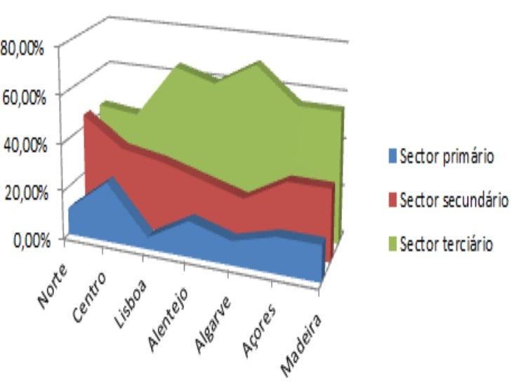 15. 15. Assimetrias regionais Como sabemos as zonas do litoral e Norte apresentam mais ofertas deemprego, para além disso ainda existem assimetrias regionais a nível dos sectores.Tal como nos países menos desenvolvidos se registam maiores percentagens dosector primário, nas regiões portuguesas menos desenvolvidas isso também sereflecte, mas de forma menos acentuada. Esta situação dá-se em principalmente naregião Centro, onde predomina um equilíbrio. No entanto a região Norte contém ainda valores consideráveis no sectorsecundário, o que ajuda positivamente a economia do país, mas infelizmente atendência é de diminuição. Na região do Algarve e da Madeira onde o Turismo é uma actividade quesobressai, e ainda no Alentejo e Açores, o sector terciário é o que se destaca, mas apresença do sector primário é também notória. Por último, Lisboa apresenta uma diferença muito grande entre o sectorterciário, que revela uma extrema importância e o sector primário onde é quaseinsignificante.