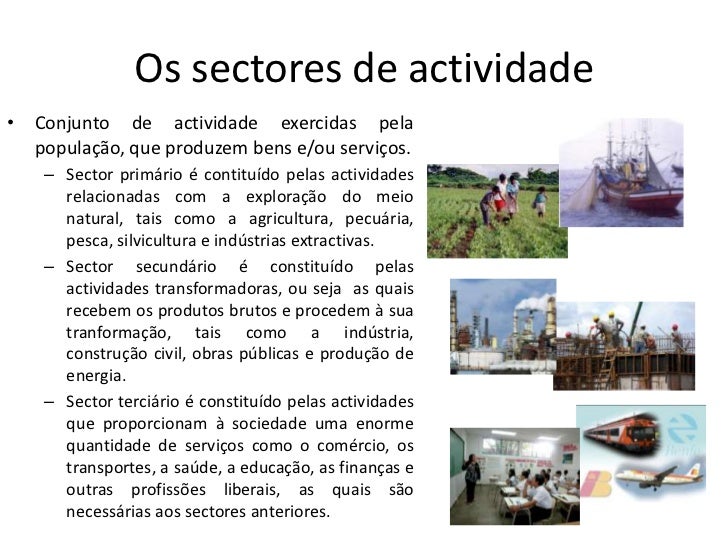 3. 3. Os sectores de actividade• Conjunto de actividade exercidas pela população, que produzem bens e/ou serviços. – Sector primário é contituído pelas actividades relacionadas com a exploração do meio natural, tais como a agricultura, pecuária, pesca, silvicultura e indústrias extractivas. – Sector secundário é constituído pelas actividades transformadoras, ou seja as quais recebem os produtos brutos e procedem à sua tranformação, tais como a indústria, construção civil, obras públicas e produção de energia. – Sector terciário é constituído pelas actividades que proporcionam à sociedade uma enorme quantidade de serviços como o comércio, os transportes, a saúde, a educação, as finanças e outras profissões liberais, as quais são necessárias aos sectores anteriores.