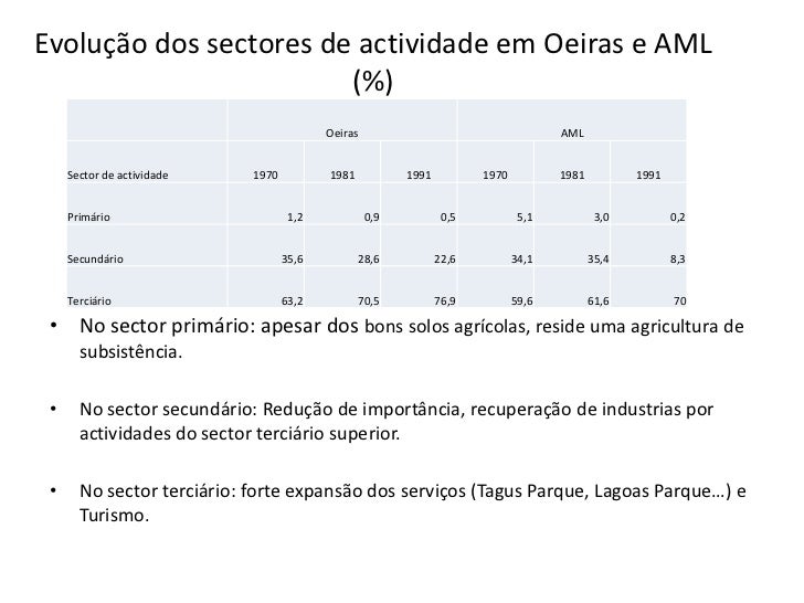 5. 5. Evolução dos sectores de actividade em Oeiras e AML (%) Oeiras AML Sector de actividade 1970 1981 1991 1970 1981 1991 Primário 1,2 0,9 0,5 5,1 3,0 0,2 Secundário 35,6 28,6 22,6 34,1 35,4 8,3 Terciário 63,2 70,5 76,9 59,6 61,6 70 • No sector primário: apesar dos bons solos agrícolas, reside uma agricultura de subsistência. • No sector secundário: Redução de importância, recuperação de industrias por actividades do sector terciário superior. • No sector terciário: forte expansão dos serviços (Tagus Parque, Lagoas Parque…) e Turismo.
