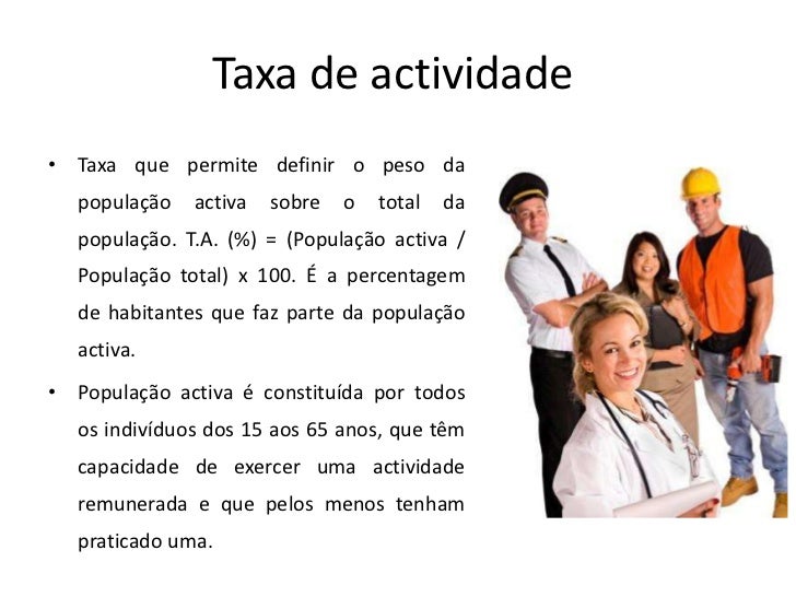 6. 6. Taxa de actividade• Taxa que permite definir o peso da população activa sobre o total da população. T.A. (%) = (População activa / População total) x 100. É a percentagem de habitantes que faz parte da população activa.• População activa é constituída por todos os indivíduos dos 15 aos 65 anos, que têm capacidade de exercer uma actividade remunerada e que pelos menos tenham praticado uma.
