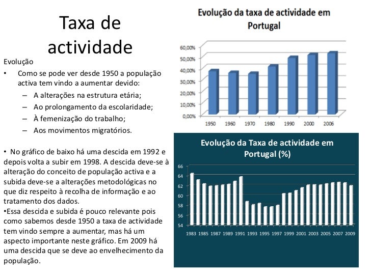 7. 7. Taxa de actividadeEvolução• Como se pode ver desde 1950 a população activa tem vindo a aumentar devido: – A alterações na estrutura etária; – Ao prolongamento da escolaridade; – À femenização do trabalho; – Aos movimentos migratórios. Evolução da Taxa de actividade em• No gráfico de baixo há uma descida em 1992 e Portugal (%)depois volta a subir em 1998. A descida deve-se à 66alteração do conceito de população activa e a 64subida deve-se a alterações metodológicas no 62que diz respeito à recolha de informação e ao 60tratamento dos dados. 58•Essa descida e subida é pouco relevante pois 56como sabemos desde 1950 a taxa de actividade 54tem vindo sempre a aumentar, mas há um 1983 1985 1987 1989 1991 1993 1995 1997 1999 2001 2003 2005 2007 2009aspecto importante neste gráfico. Em 2009 háuma descida que se deve ao envelhecimento dapopulação.