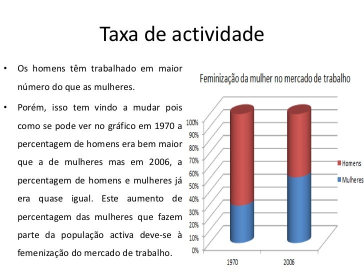 8. 8. Taxa de actividade• Os homens têm trabalhado em maior número do que as mulheres.• Porém, isso tem vindo a mudar pois como se pode ver no gráfico em 1970 a percentagem de homens era bem maior que a de mulheres mas em 2006, a percentagem de homens e mulheres já era quase igual. Este aumento de percentagem das mulheres que fazem parte da população activa deve-se à femenização do mercado de trabalho.
