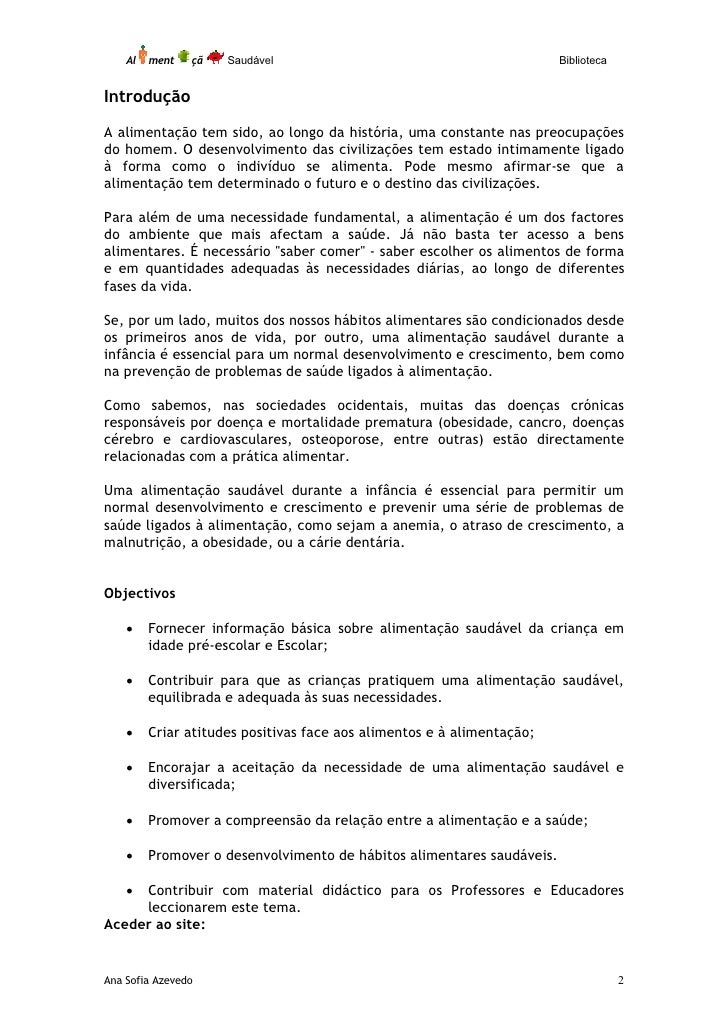 2. 2. Al ment çã Saudável Biblioteca Introdução A alimentação tem sido, ao longo da história, uma constante nas preocupações do homem. O desenvolvimento das civilizações tem estado intimamente ligado à forma como o indivíduo se alimenta. Pode mesmo afirmar-se que a alimentação tem determinado o futuro e o destino das civilizações. Para além de uma necessidade fundamental, a alimentação é um dos factores do ambiente que mais afectam a saúde. Já não basta ter acesso a bens alimentares. É necessário quot;saber comerquot; - saber escolher os alimentos de forma e em quantidades adequadas às necessidades diárias, ao longo de diferentes fases da vida. Se, por um lado, muitos dos nossos hábitos alimentares são condicionados desde os primeiros anos de vida, por outro, uma alimentação saudável durante a infância é essencial para um normal desenvolvimento e crescimento, bem como na prevenção de problemas de saúde ligados à alimentação. Como sabemos, nas sociedades ocidentais, muitas das doenças crónicas responsáveis por doença e mortalidade prematura (obesidade, cancro, doenças cérebro e cardiovasculares, osteoporose, entre outras) estão directamente relacionadas com a prática alimentar. Uma alimentação saudável durante a infância é essencial para permitir um normal desenvolvimento e crescimento e prevenir uma série de problemas de saúde ligados à alimentação, como sejam a anemia, o atraso de crescimento, a malnutrição, a obesidade, ou a cárie dentária. Objectivos  Fornecer informação básica sobre alimentação saudável da criança em idade pré-escolar e Escolar;  Contribuir para que as crianças pratiquem uma alimentação saudável, equilibrada e adequada às suas necessidades.  Criar atitudes positivas face aos alimentos e à alimentação;  Encorajar a aceitação da necessidade de uma alimentação saudável e diversificada;  Promover a compreensão da relação entre a alimentação e a saúde;  Promover o desenvolvimento de hábitos alimentares saudáveis. Contribuir com material didáctico para os Professores e Educadores leccionarem este tema. Aceder ao site: Ana Sofia Azevedo 2