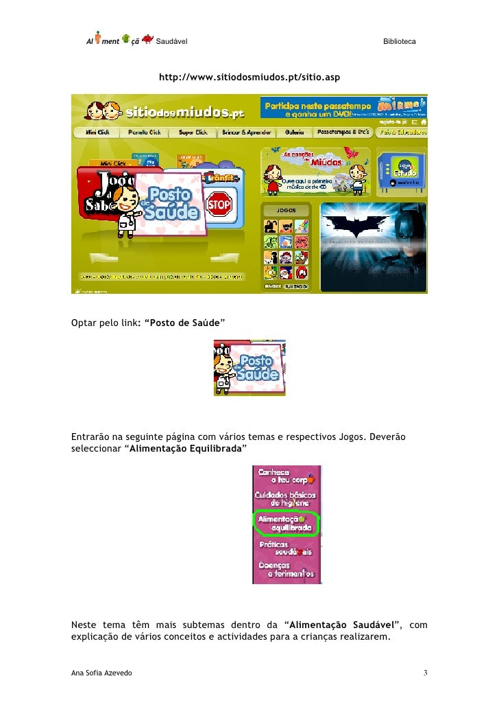 3. 3. Al ment çã Saudável Biblioteca http://www.sitiodosmiudos.pt/sitio.asp Optar pelo link: “Posto de Saúde” Entrarão na seguinte página com vários temas e respectivos Jogos. Deverão seleccionar “Alimentação Equilibrada” Neste tema têm mais subtemas dentro da “Alimentação Saudável”, com explicação de vários conceitos e actividades para a crianças realizarem. Ana Sofia Azevedo 3
