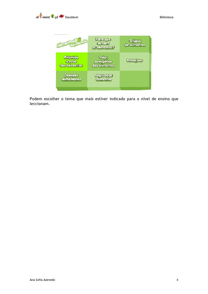 4. 4. Al ment çã Saudável Biblioteca Podem escolher o tema que mais estiver indicado para o nível de ensino que leccionam. Ana Sofia Azevedo 4