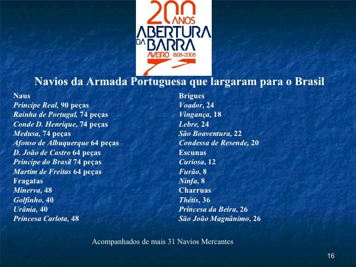 14. 16. Naus Príncipe Real, 90 peças Rainha de Portugal, 74 peças Conde D. Henrique, 74 peças Medusa, 74 peças Afonso de Albuquerque 64 peças D. João de Castro 64 peças Príncipe do Brasil 74 peças Martim de Freitas 64 peças Fragatas Minerva, 48 Golfinho, 40 Urânia, 40 Princesa Carlota, 48 Navios da Armada Portuguesa que largaram para o Brasil Brigues Voador , 24 Vingança, 18 Lebre, 24 São Boaventura, 22 Condessa de Resende, 20 Escunas Curiosa , 12 Furão , 8 Ninfa , 8 Charruas Thétis , 36 Princesa da Beira , 26 São João Magnânimo , 26 Acompanhados de mais 31 Navios Mercantes