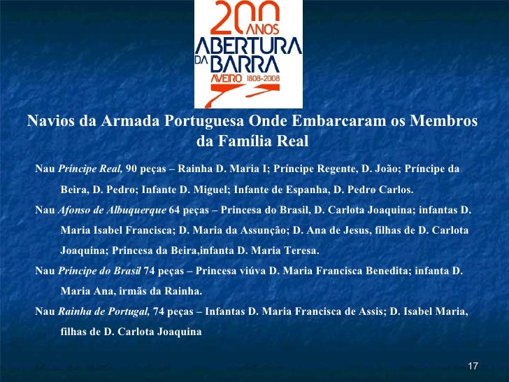 15. 17. Nau Príncipe Real, 90 peças – Rainha D. Maria I; Príncipe Regente, D. João; Príncipe da Beira, D. Pedro; Infante D. Miguel; Infante de Espanha, D. Pedro Carlos. Nau Afonso de Albuquerque 64 peças – Princesa do Brasil, D. Carlota Joaquina; infantas D. Maria Isabel Francisca; D. Maria da Assunção; D. Ana de Jesus, filhas de D. Carlota Joaquina; Princesa da Beira,infanta D. Maria Teresa. Nau Príncipe do Brasil 74 peças – Princesa viúva D. Maria Francisca Benedita; infanta D. Maria Ana, irmãs da Rainha. Nau Rainha de Portugal, 74 peças – Infantas D. Maria Francisca de Assis; D. Isabel Maria, filhas de D. Carlota Joaquina Navios da Armada Portuguesa Onde Embarcaram os Membros da Família Real