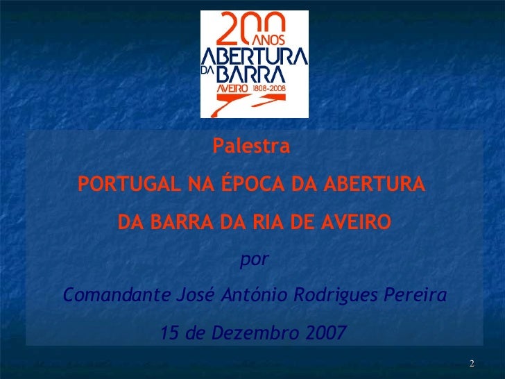 2. 2. Palestra PORTUGAL NA ÉPOCA DA ABERTURA DA BARRA DA RIA DE AVEIRO por Comandante José António Rodrigues Pereira 15 de Dezembro 2007